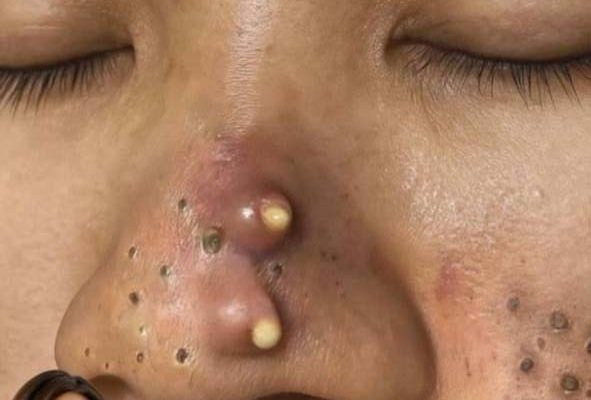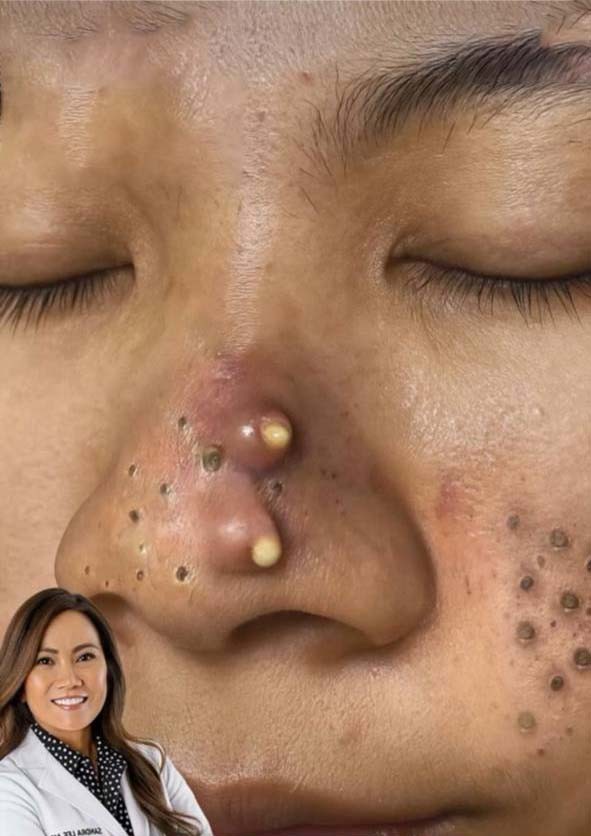 The image you’ve shared presents a more advanced case of skin congestion than typical blackheads, featuring a combination of blackheads, what appear to be inflamed pustules, and possibly a cyst or deeper nodule on the nose. This visually striking example underscores the importance of professional dermatological care for severe skin conditions.