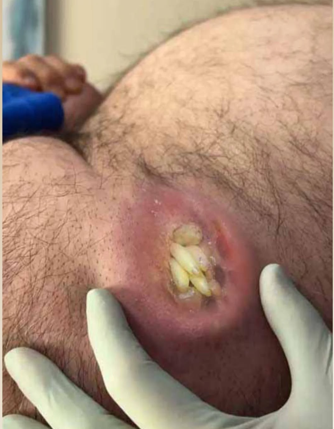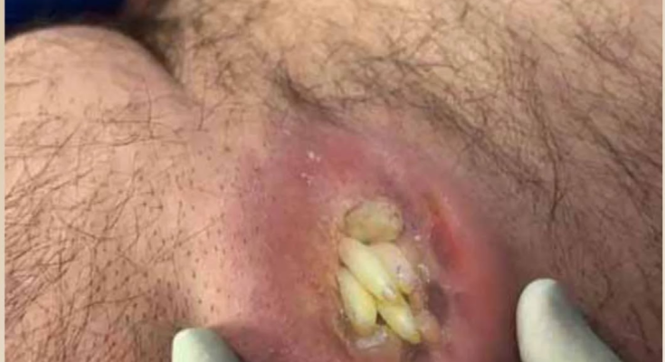 Cysts are common skin conditions that can appear anywhere on the body. They often look alarming, especially when they swell, turn red, or begin to drain thick material. The image above shows a case of an inflamed cyst, where a buildup of keratin—a protein found in skin, hair, and nails—was released.