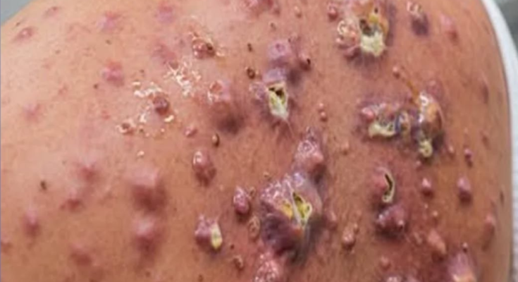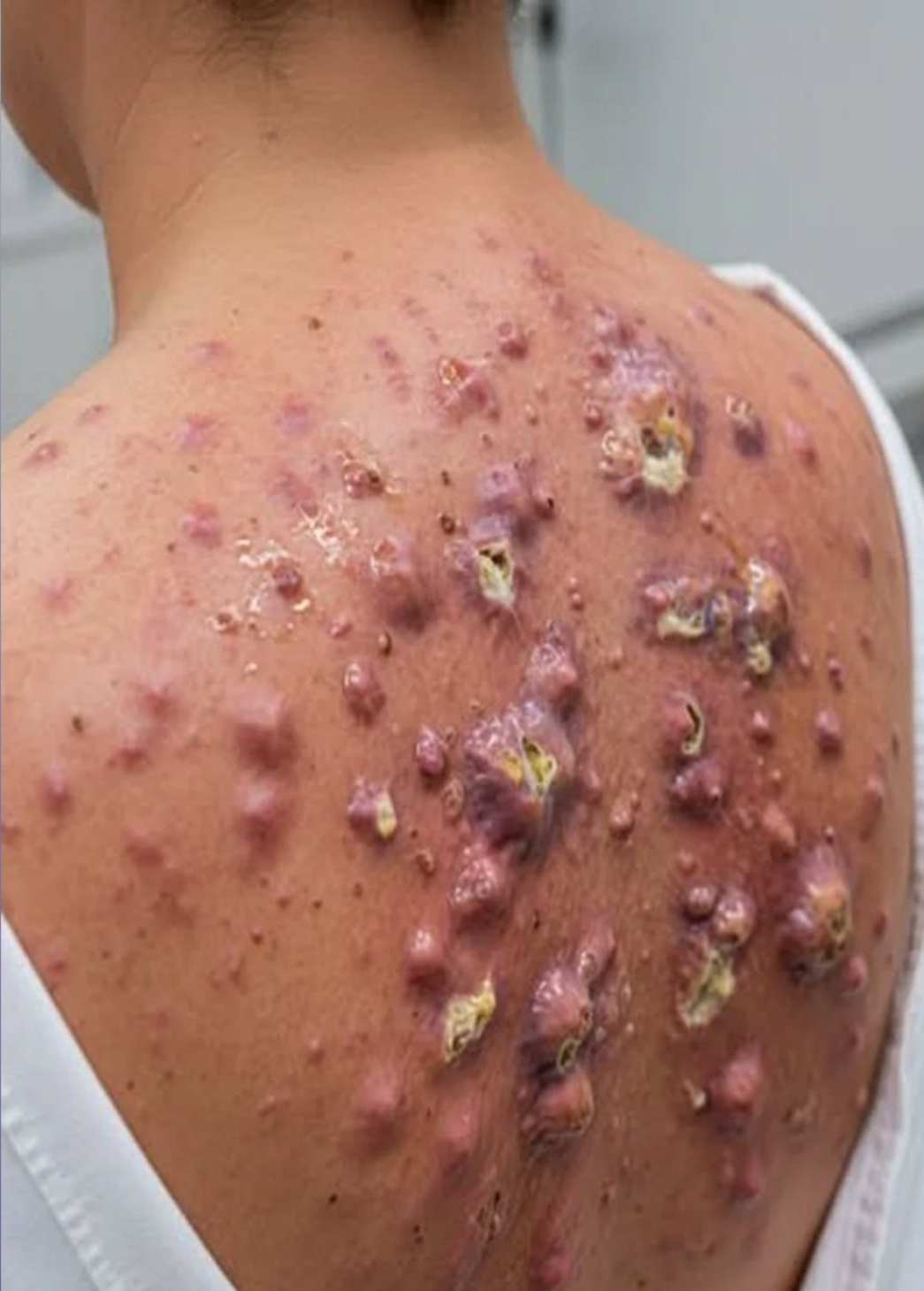 Back acne, often referred to as “bacne,” is a common skin condition that affects people of all ages. However, in severe cases, it can progress beyond simple pimples into large, painful cysts, nodules, and infected lesions. The image above demonstrates an advanced stage of back acne that has developed into inflamed nodular acne with possible secondary infection.