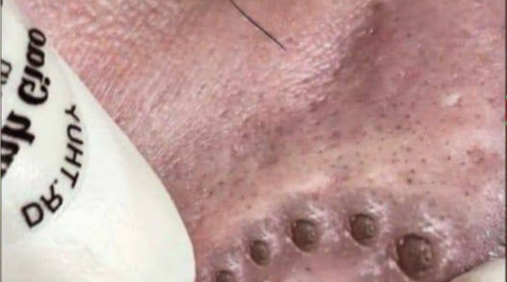 The image shows a close-up view of a person undergoing a professional comedone extraction procedure. The skin displays multiple enlarged blackheads, deep-seated clogged pores, and inflamed lesions—common signs of severe comedonal acne. This type of condition often develops when pores become blocked with sebum, dead skin cells, and bacteria, eventually forming visible bumps on the surface of the skin.