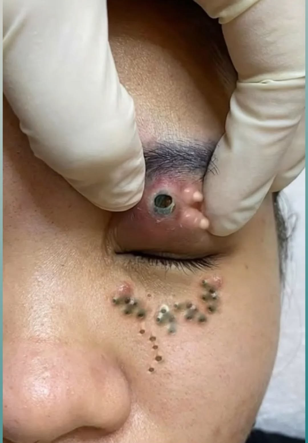 Periorbital and eyelid lesions represent a broad spectrum of dermatologic and infectious conditions. Because the ocular adnexa contain numerous sebaceous glands, sweat glands, hair follicles, and thin dermal tissue, pathologic processes in this region often present with pronounced inflammation. The image provided demonstrates significant upper eyelid edema, a central cutaneous opening with discoloration, and multiple papular and pigmented lesions distributed along the lower eyelid and malar region.