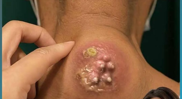 The severe lesion shown is consistent with a large abscess or carbuncle, characterized by swelling, inflammation, and multiple draining areas. While it may start from a small infection, such advanced cases require professional medical treatment to prevent complications. With proper care, hygiene, and monitoring, most individuals recover fully and avoid recurrence.