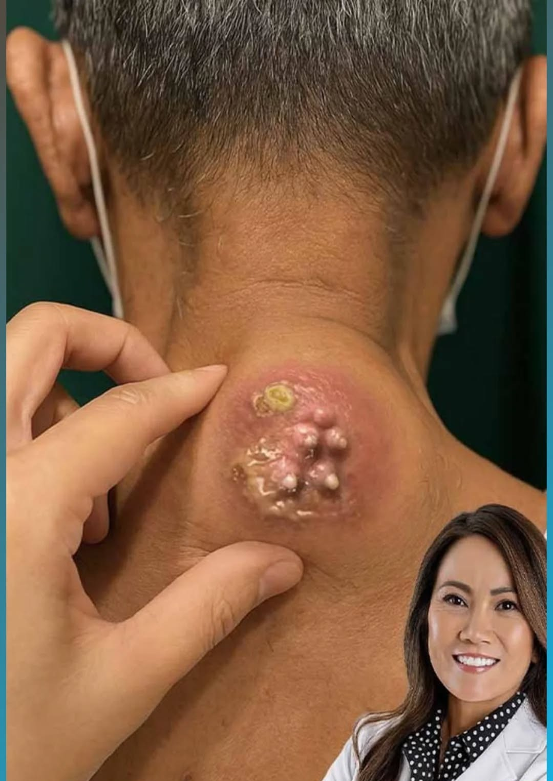 Skin infections are common, but some cases progress to a much more serious stage, forming large abscesses, multiple pus-filled bumps, and inflamed nodules. The image shows a large, swollen lesion on the back of the neck, with multiple pustules, a central yellowish area, and surrounding redness, indicating a severe, advanced skin infection. This type of lesion may represent a carbuncle, deep abscess, or bacterial infection with draining sinuses.