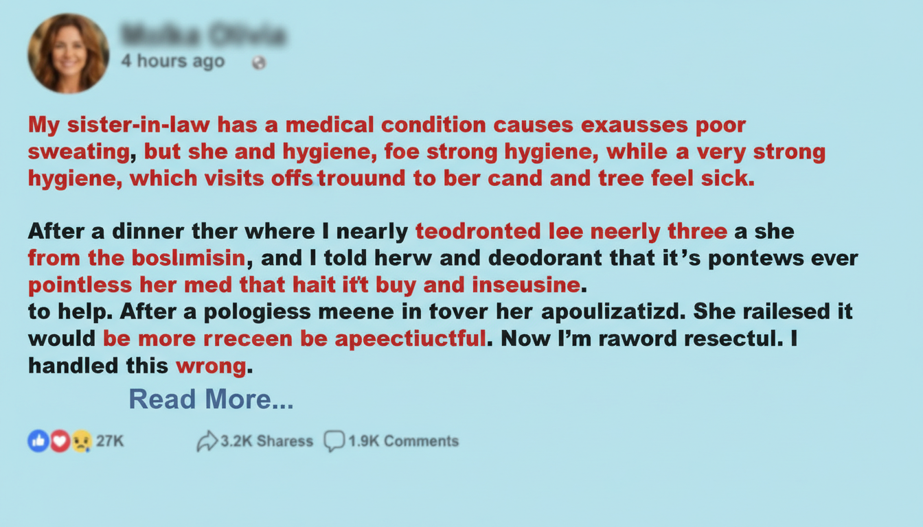 My SIL has a health condition that causes her to sweat more than average, she can nothing at all physically but still be sweating bullets, it can even be cold out and she still breaks a sweat. This is something that I’ve always known about her since we started talking back in high school and although we weren’t super close back then it was something I can live with. Now flash forward to modern day and I’m now with her brother, and she often likes to stop by very often since we live very close together, this I absolutely don’t mind since she’s overall a sweet person and likes to bring free food. The only issue is that she smells, like absolutely foul.