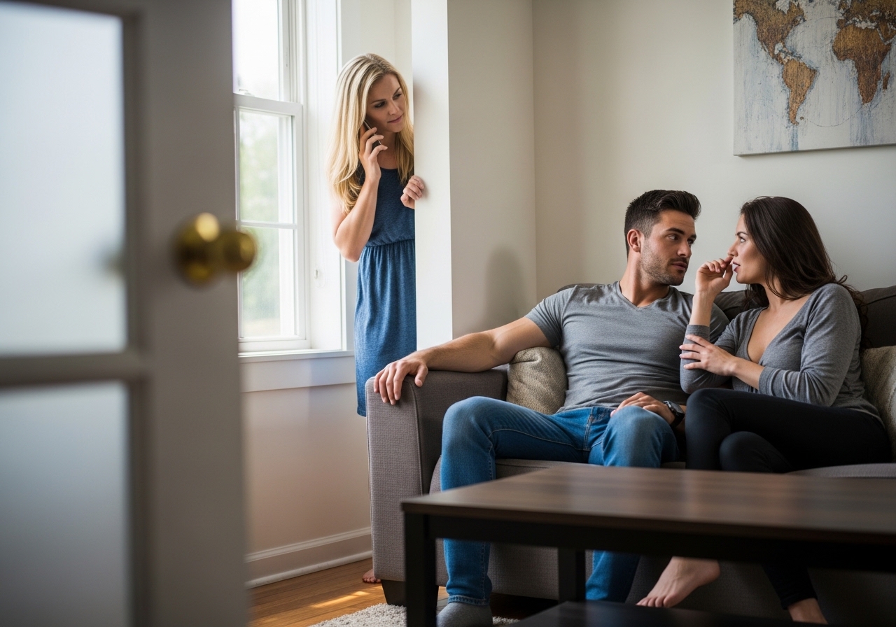 My legs moved before my brain caught up. I stepped into the living room, and the sight of her hit me hard. She was perched on the edge of the sofa, angled toward my husband. The wine bottle sat on the coffee table like a prop.