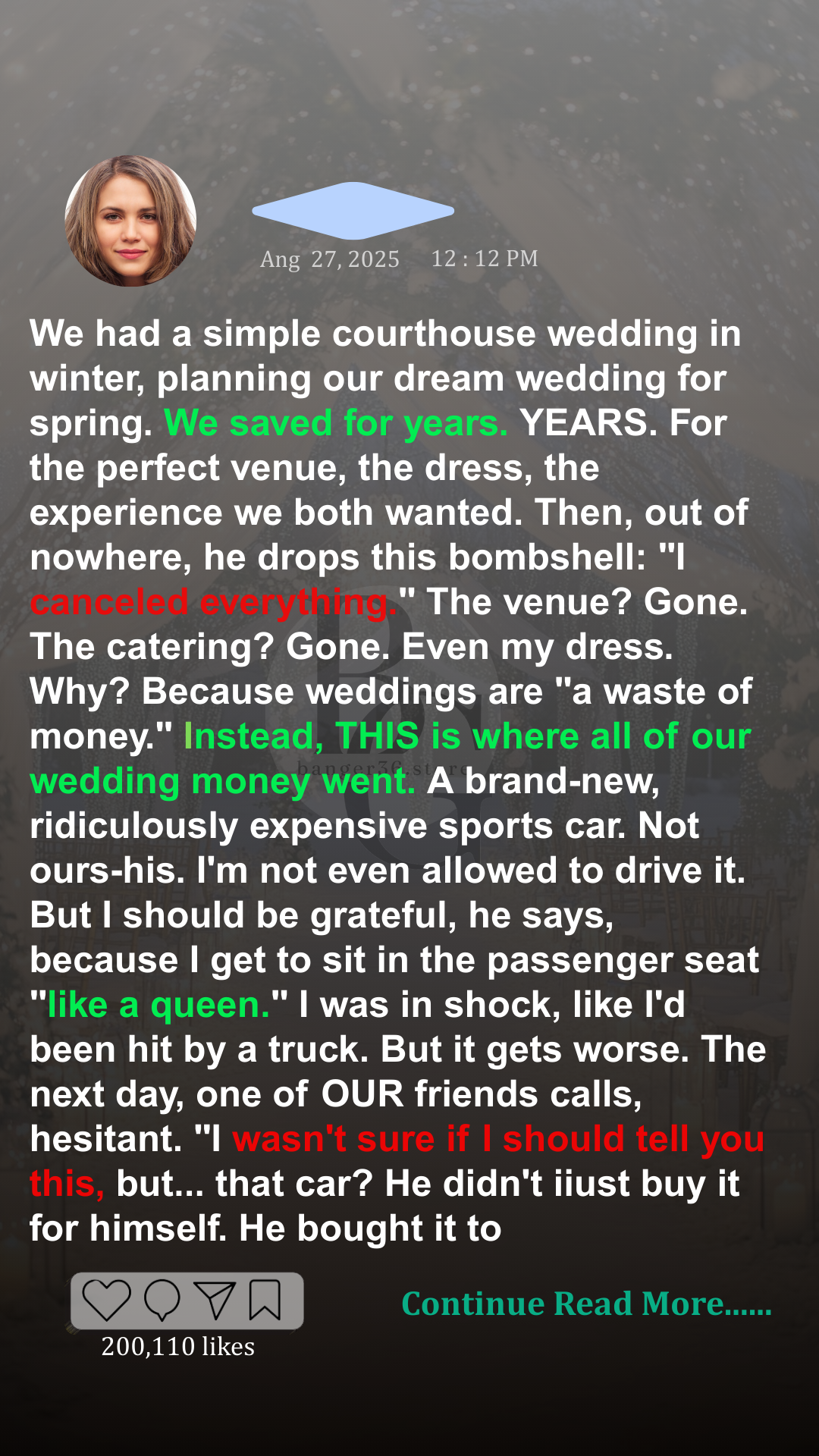 we were already married, so why spend on a party? I was stunned. All our savings, all our plans – gone in