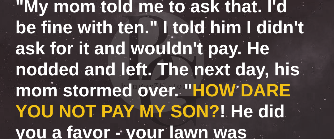 Homeownership is an American dream… until your neighbor thinks your lawn is her business. Mine sent her son to mow it without asking, then demanded $50. I refused and gave her a taste of her own logic… because some lessons hit harder when the mirror turns back on you.The late afternoon sun beat down on my neck as I pulled into the driveway of my new home. Twenty-nine years old and finally a homeowner. What a milestone! The modest two-bedroom in Oakridge Estates wasn’t much, but every mortgage payment, every creaky floorboard, and every blade of grass was… mine. I killed the engine and sat for a moment, taking it all in. It had been three weeks since I’d moved in, and the reality still hadn’t fully sunk in. The “For Sale” sign was gone, replaced by my beloved flower beds. As I stepped out of my car, the distinct buzz of a lawnmower caught my attention. Odd. I wasn’t expecting landscapers. Rounding the corner of my house, I stopped short. A lanky teenager was pushing a mower across my front yard, already having cut neat lines through half of it. He hadn’t noticed me yet and was focused on his task with wireless earbuds jammed in his ears. I approached slowly, waving to get his attention. “Hey there,” I called out when he finally looked up. The boy—maybe 13 or 14—pulled out an earbud. His face was flushed from the heat and sweat dampened his brown hair. “Hi,” he replied, letting the mower idle. I’m Alex,” I said, gesturing toward the house. “I live here. Did I… miss something? Why are you mowing my yard?” The kid shifted uncomfortably, glancing down at his sneakers before meeting my eyes again. “I’m Tyler. I live over there,” he pointed to the blue colonial across the street.