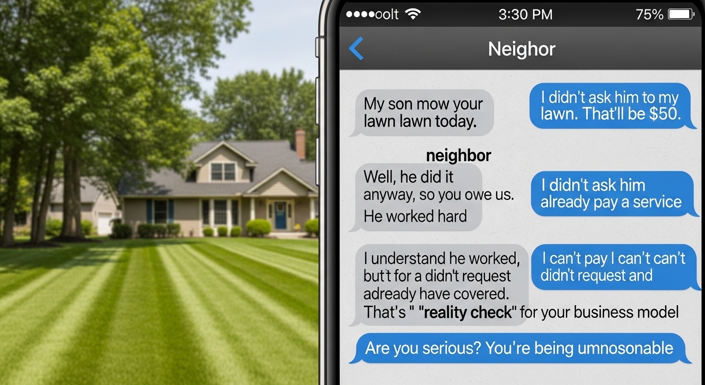 “Look, Tyler, I appreciate the initiative, but I didn’t actually ask anyone to mow my lawn. I was planning to do it myself this weekend.”