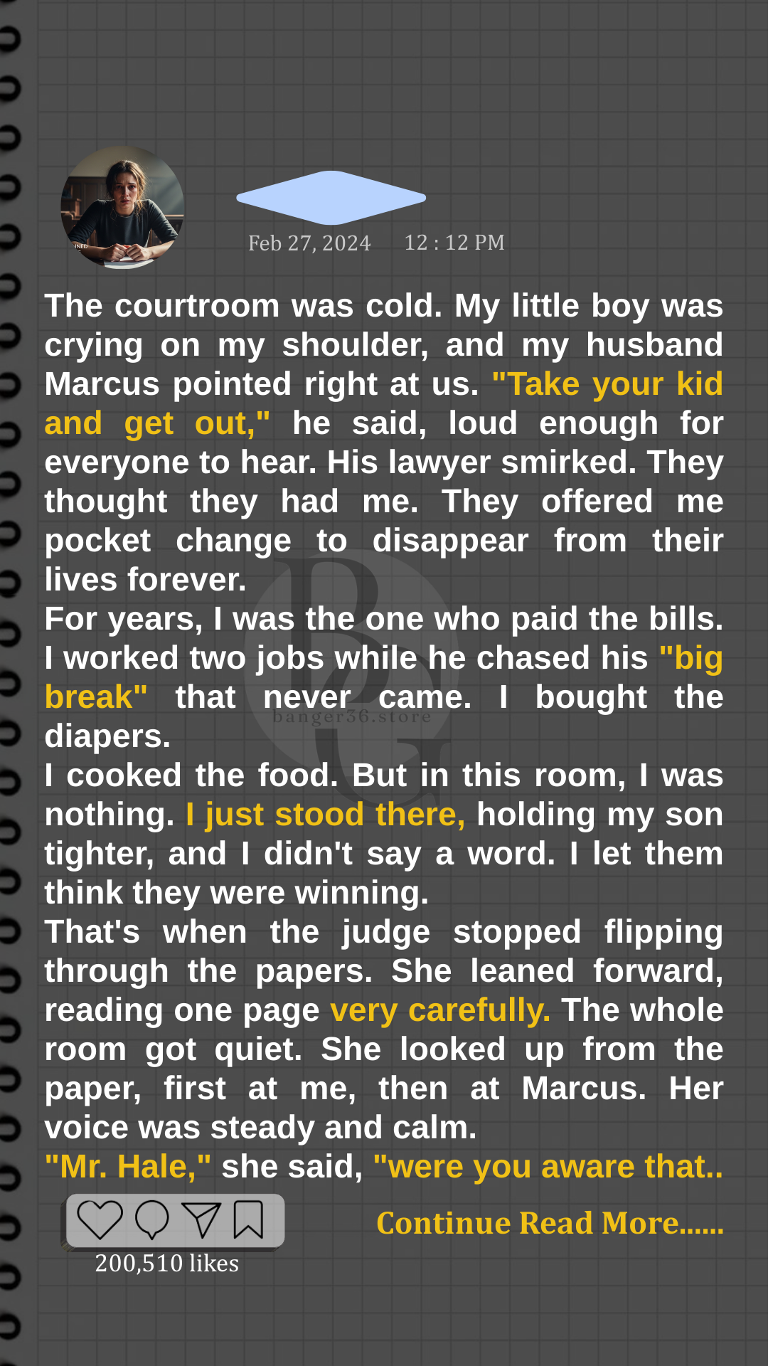 The courtroom was cold. My little boy was crying on my shoulder, and my husband Marcus pointed right at us. “Take your kid and get out,” he said, loud enough for everyone to hear. His lawyer smirked. They thought they had me. They offered me pocket change to disappear from their lives forever. For years, I was the one who paid the bills. I worked two jobs while he chased his “big break” that never came. I bought the diapers. I cooked the food. But in this room, I was nothing. I just stood there, holding my son tighter, and I didn’t say a word. I let them think they were winning. That’s when the judge stopped flipping through the papers. She leaned forward, reading one page very carefully. The whole room got quiet. She looked up from the paper, first at me, then at Marcus. Her voice was steady and calm. “Mr. Hale,” she said, “were you aware that your wife is the sole owner of the downtown commercial property?” There are moments in life when humiliation burns so hot it almost blinds you. And then there are moments when the same fire becomes light. That day, standing in a courtroom with my child shaking against my chest and my marriage collapsing in public, I felt both. I walked in looking like a woman they expected to crush. I walked out knowing silence can be sharper than any scream. Marcus had always been good at performance. That was one of the first things people loved about him. He had charm that filled a room before he even sat down. He knew how to lean in when he spoke, how to make his dreams sound contagious, how to make laziness look like ambition waiting for the right opportunity. When I met him, I mistook confidence for capability.