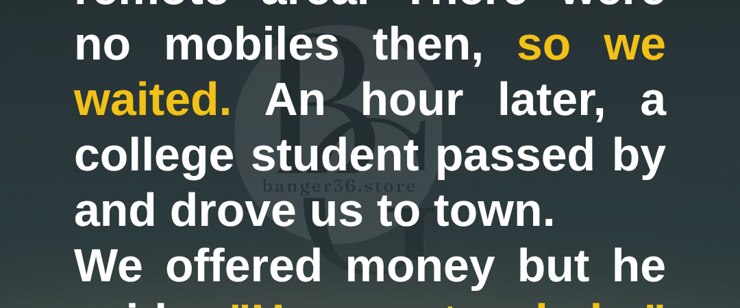 A worn-out sedan approached slowly and stopped beside us. The driver, a young man who looked like a college student, rolled down his window and asked if we needed help. My wife and I exchanged a quick glance—relief mixed with hesitation. But we had no choice.