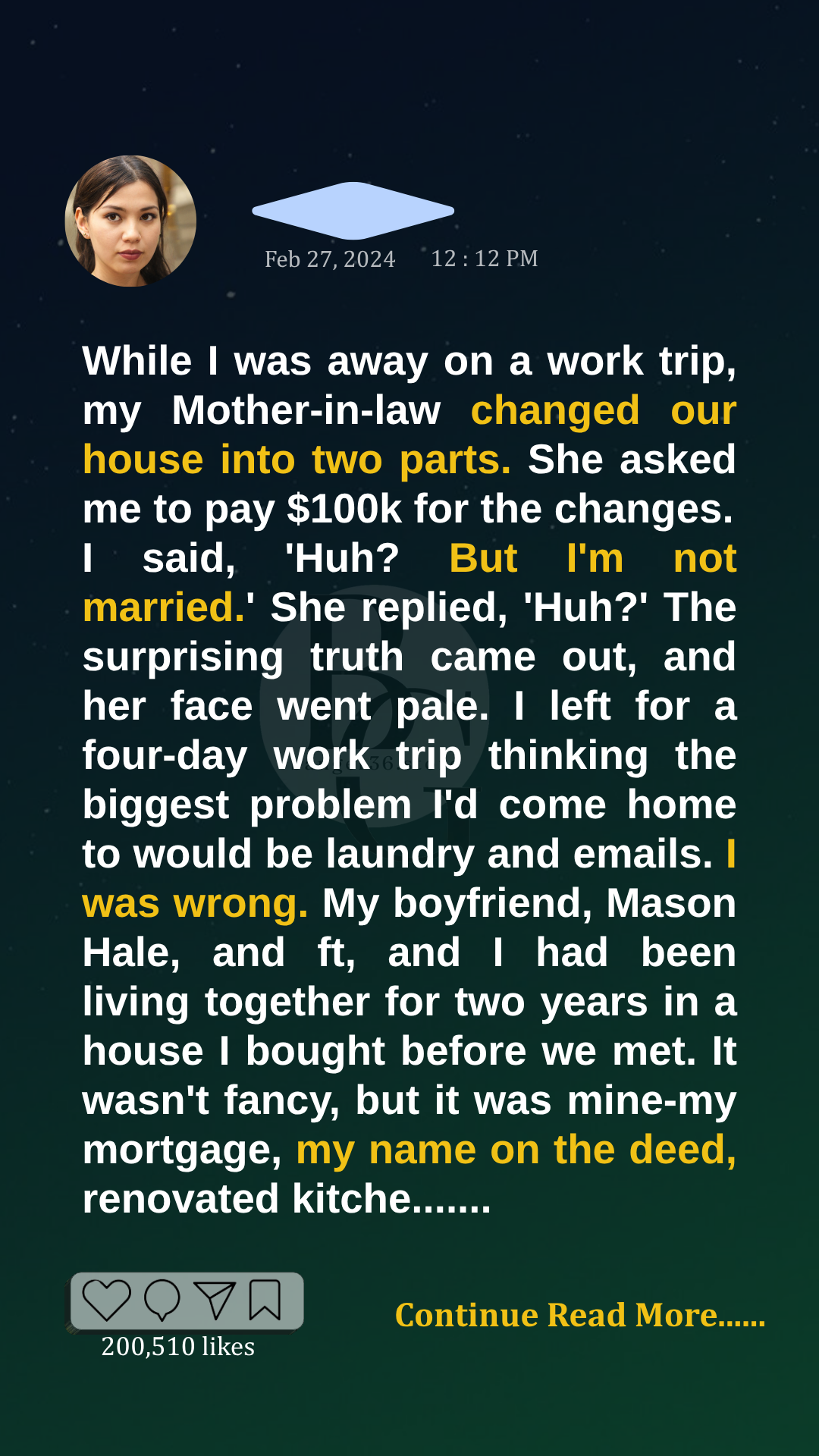 While I was away on a work trip, my Mother-in-law changed our house into two parts. She asked me to pay $100k for the changes. I said, ‘Huh? But I’m not married.’ She replied, ‘Huh?’ The surprising truth came out, and her face went pale.