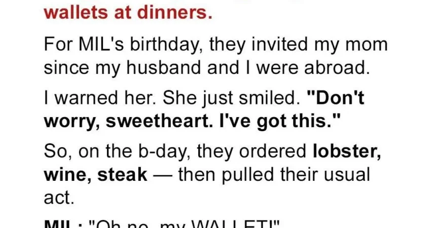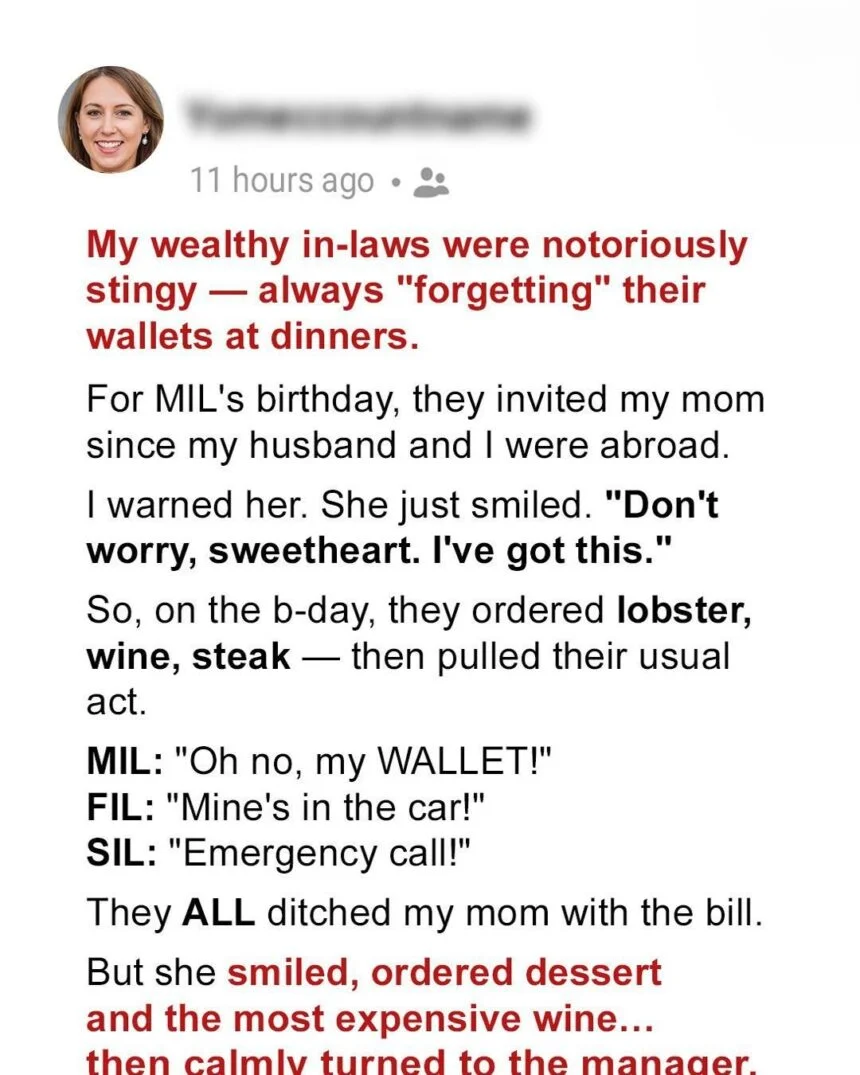 For years, my wealthy in-laws had a strange habit: they’d “forget” their wallets at restaurants, leaving others to pick up their lavish bills. I’d warned my husband, Dan, that one day this behavior would catch up to them. But I never imagined that lesson would come from my own mother.