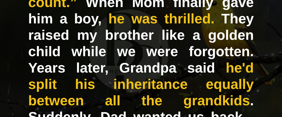 Dad wanted a son and never hid it. He told Mom right after I was born, apparently, in the hospital, “Don’t get too attached. We’ll try again.” He never said it in front of us, but you could feel it in everything he didn’t say. No hugs, no “I’m proud of you,” just silence and cold stares.