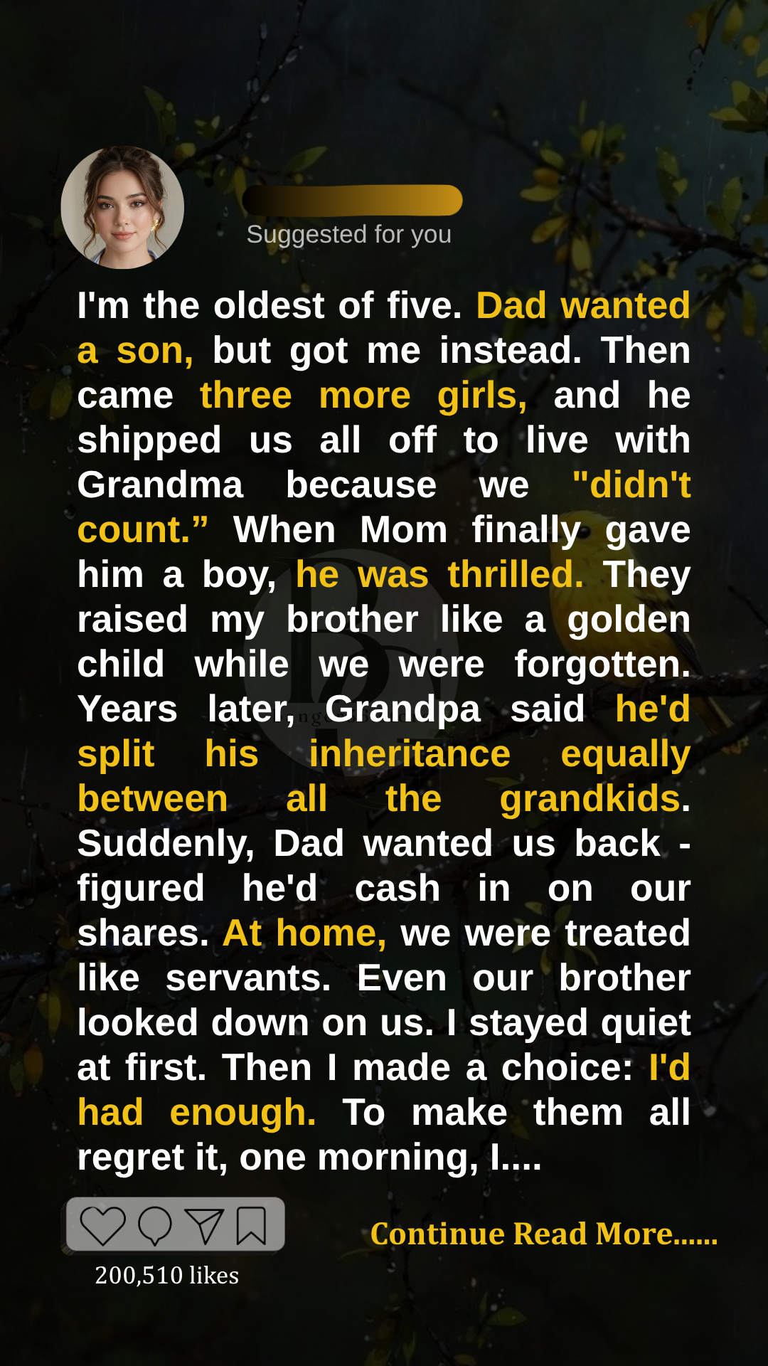 I’m the oldest of five. My name’s Hannah. Then came Rachel, then Lily, then Ava. Four girls, one after the other. And to Dad, that was a problem.
