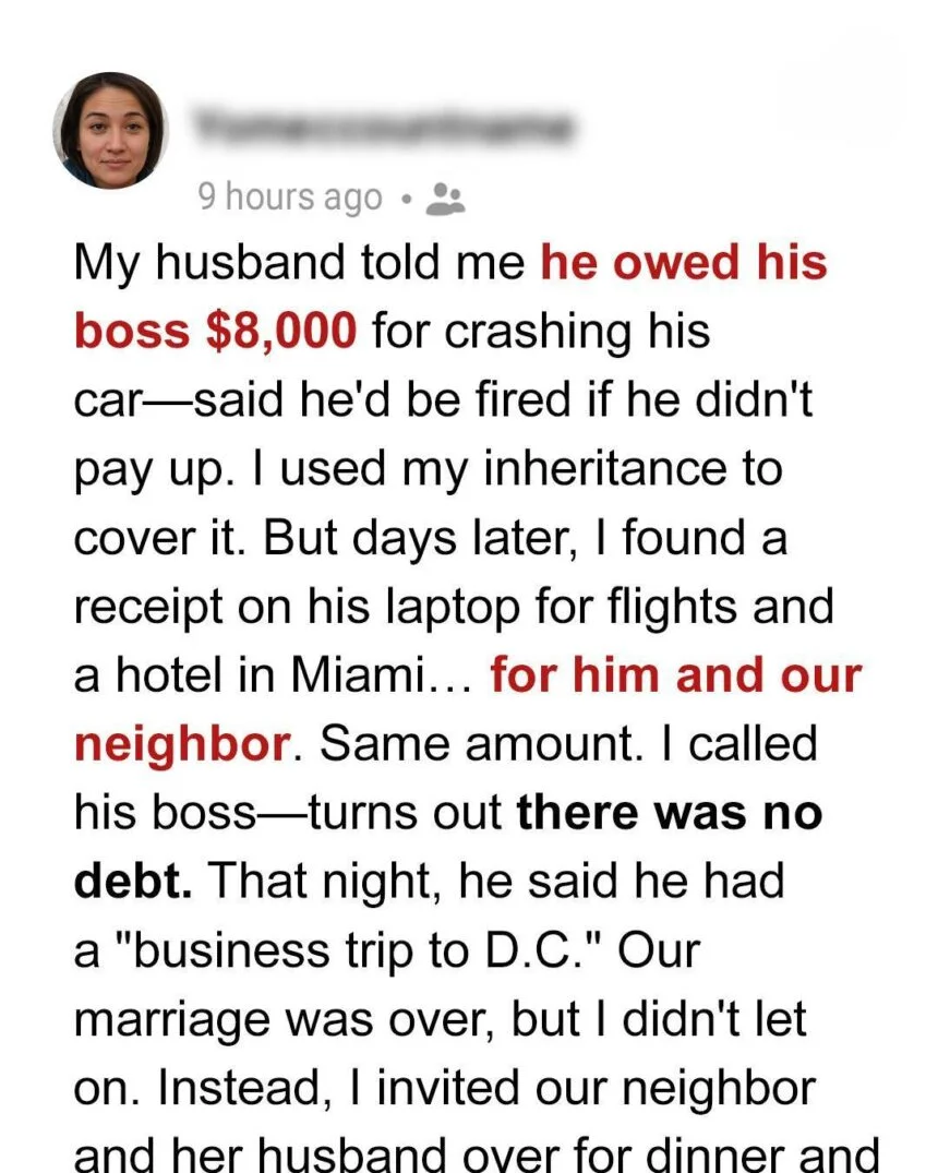 Exactly $7,983—nearly the precise amount Mike had “needed” for his nonexistent car accident. A quick call to his boss confirmed my suspicions: there had been no crash. Mike hadn’t just broken my heart; he had robbed me to fund a luxury getaway with another man’s wife.