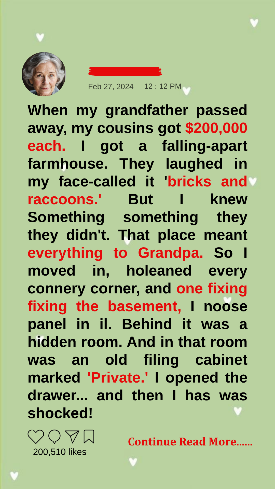 My grandfather had built it with his own hands. Every nail, every beam, every crooked step had a story. When I was a kid, I used to sit with him on the porch while he told me, “This house takes care of the people who take care of it.” So instead of selling it, I moved in. At first, it was rough. Dust everywhere. Pipes barely working. The roof leaked when it rained. Every night, I heard scratching in the walls. But little by little, I fixed things. I cleaned every corner. Repaired what I could. Learned what I didn’t know. Weeks turned into months. And slowly, the house started to feel alive again. Then one afternoon, while working in the basement, I noticed something strange. One of the wooden wall panels didn’t sit flush. It looked off. At first, I ignored it. The whole house was falling apart—of course things looked off. But something about it kept bothering me. So I grabbed a screwdriver and pried it open. Behind it was empty space. A narrow gap leading to a hidden room. My heart started pounding. I widened the opening and squeezed through. Inside, the air was thick and stale. The room was small, unfinished, like it had been sealed off decades ago. And in the center of it was an old metal filing cabinet. Gray, rusted, locked. On the front, in faded handwriting, were the words “Private.” My hands were shaking as I pulled it open. Inside were folders. Dozens of them. Old documents. Maps. Letters. At first, I didn’t understand what I was looking at. Then I saw the names. Land parcels. Property deeds. All under my grandfather’s name. I flipped through them faster, my breath catching in my throat.