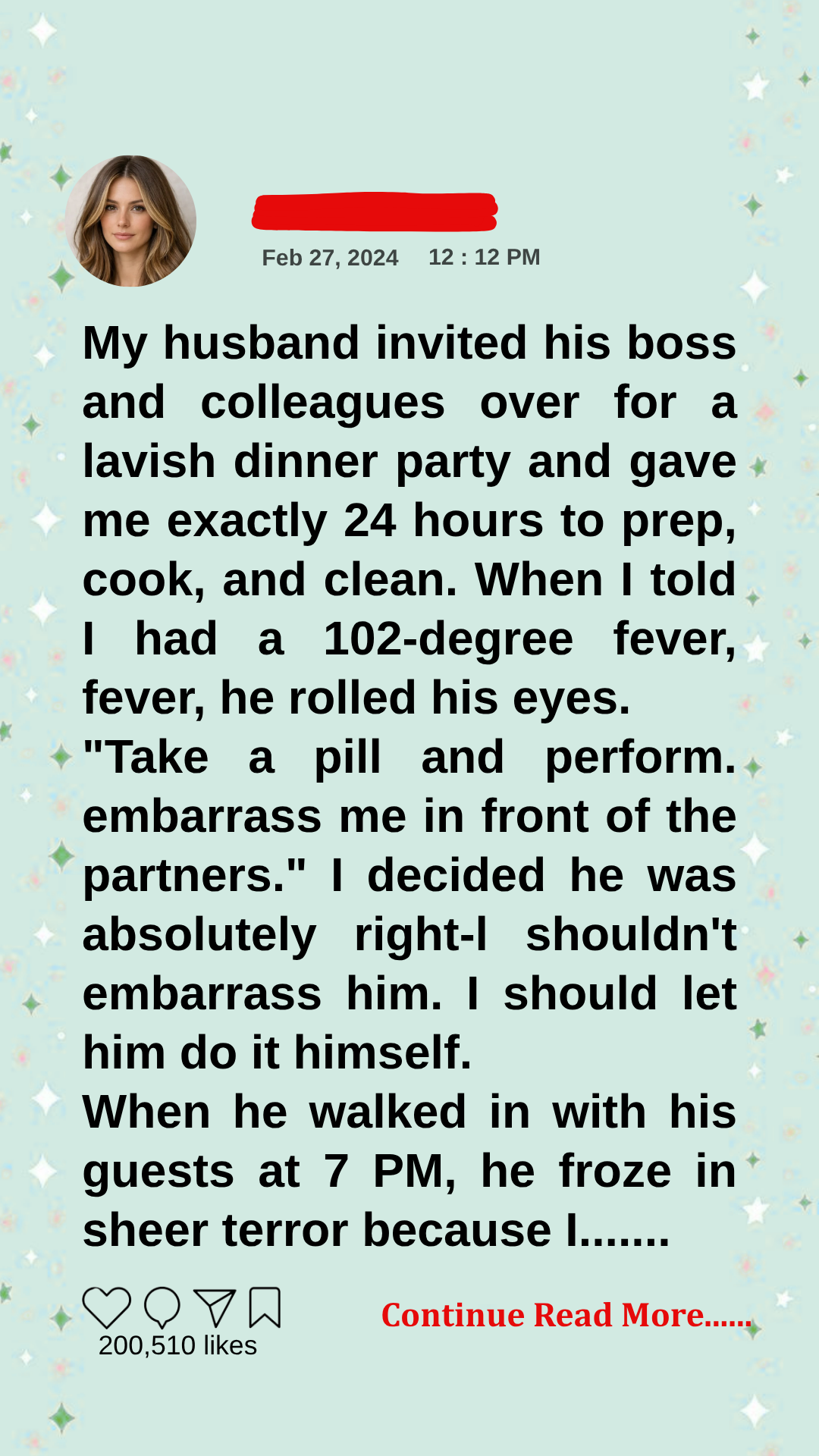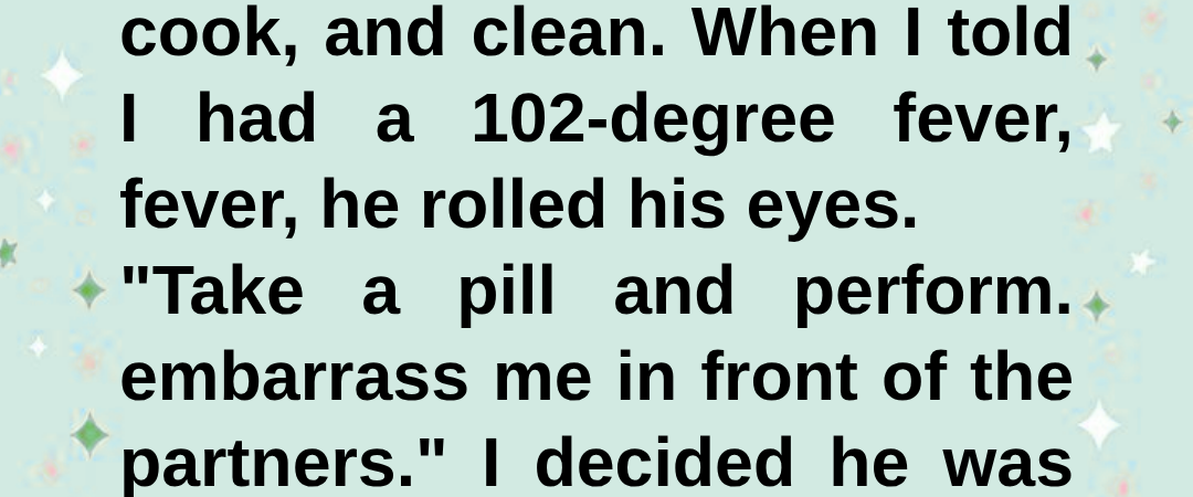 “I’m performing, just like you asked!” I offered a warm, heavily congested smile to the bewildered executives standing in our foyer. “Welcome, gentlemen. I apologize for my attire, but Arthur insisted we simply must host you tonight, even after my fever spiked to 102 this morning. I told him I was highly contagious, but he was adamant. ‘Take a pill and perform,’ he told me. ‘Don’t embarrass me.’ So, here I am! The show must go on.”