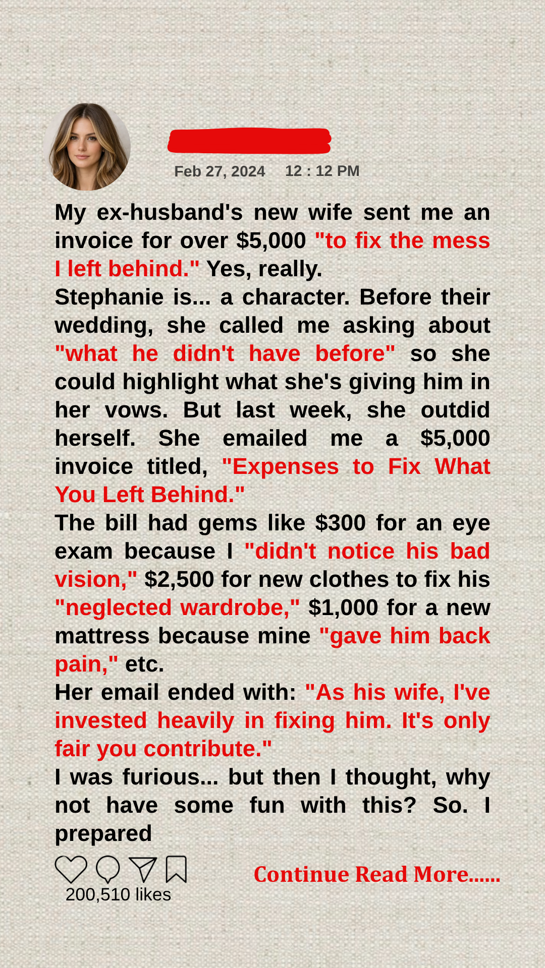 I had been divorced from Matt for two years. Life had moved on—or so I thought. Then his new wife, Stephanie, decided to send me a bill for everything she thought I’d “broken” in Matt’s life.
