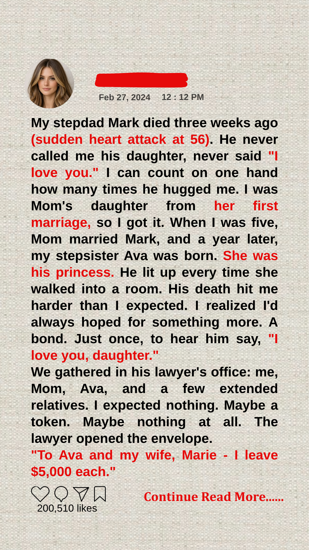 Mark came into my life when my mother was still young. She had me early, before she really knew who she was, and when she married Mark, it felt like she finally got the happy ending she deserved. Not long after, my little sister Ava was born—and everything changed.