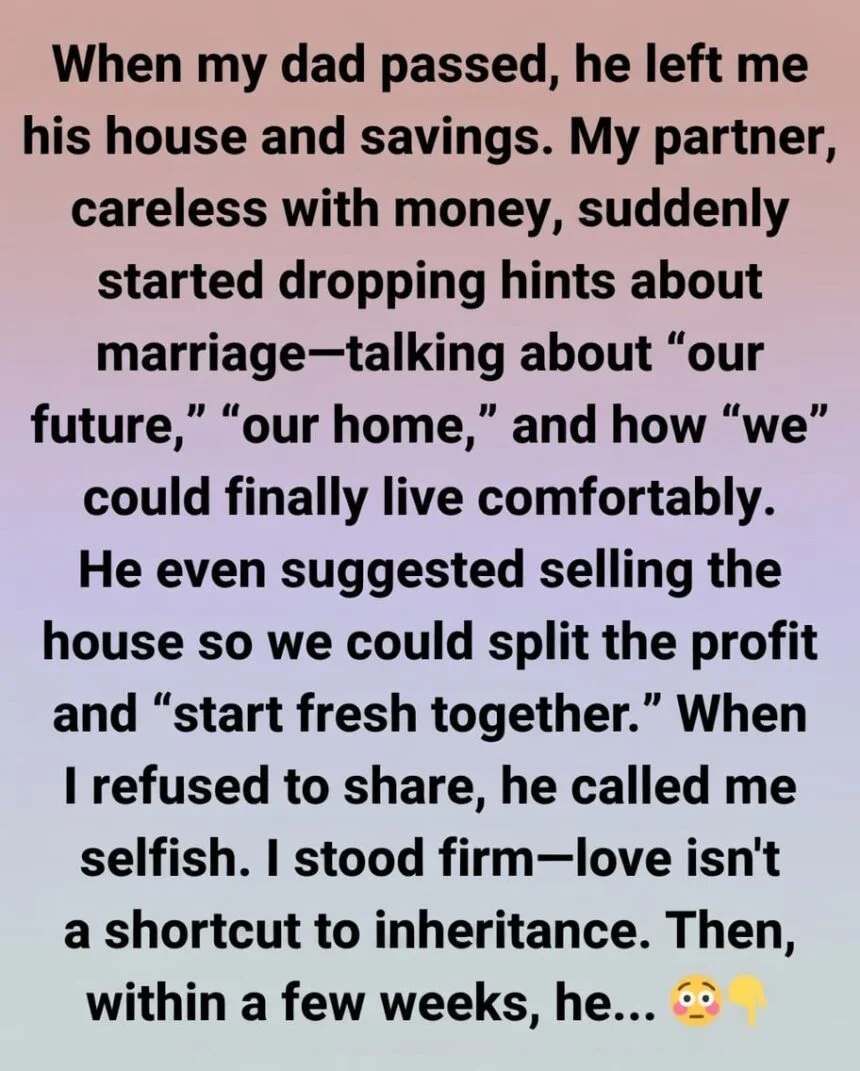 When someone suddenly becomes more affectionate, more committed, more focused on “our future” only after you inherit something valuable, that isn’t love growing deeper. It’s interest waking up. It’s someone realizing there’s something to gain. And in relationships, that kind of timing speaks louder than any romantic words ever could.
