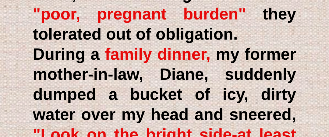 I never told my ex-husband or his wealthy family that I secretly owned the multi-billion-dollar company they all worked for. To them, I was nothing more than a “poor, pregnant burden” they tolerated out of obligation. During a family dinner, my former mother-in-law, Diane, suddenly dumped a bucket of icy, dirty water over my head and sneered, “Look on the bright side—at least you finally got a bath.” Brendan laughed. His girlfriend, Jessica, stifled a giggle. I sat there, soaked and shaking, water dripping from my hair and clothes—while they waited for me to break.