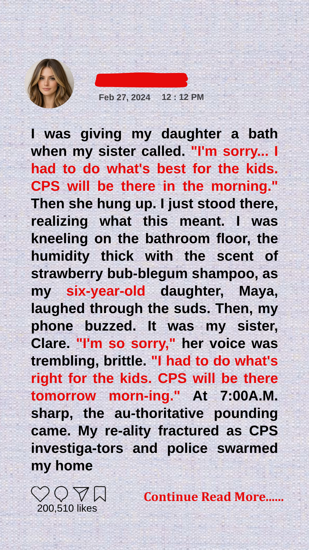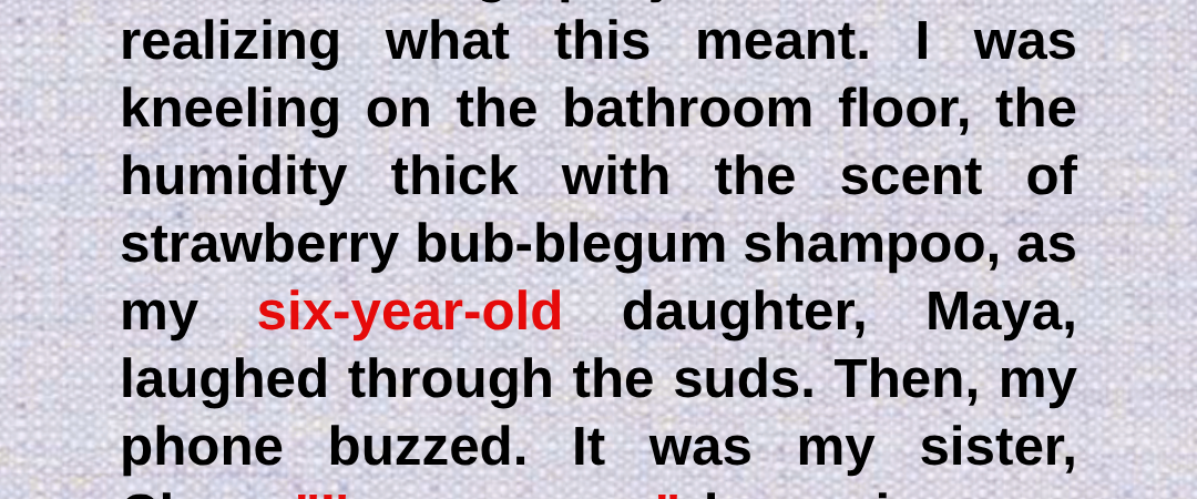 I was kneeling on the bathroom floor, the humidity thick with the scent of strawberry bubblegum shampoo, rinsing suds from my six-year-old daughter’s hair. Maya was laughing, trying to shape the foam into a crown, when my phone buzzed on the counter. It was my sister, Clare.