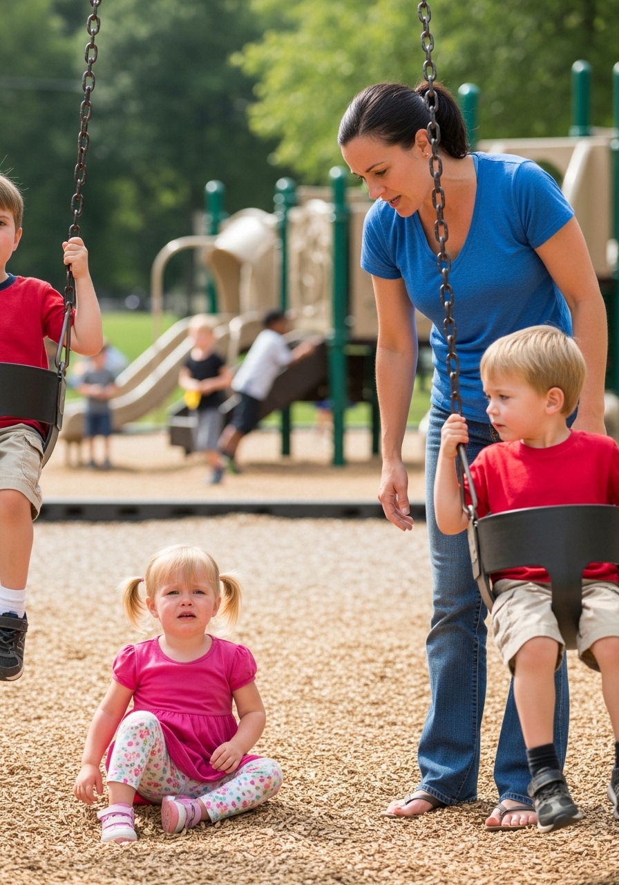 It happened in a fraction of a second. My daughter was tossed from the plastic seat, tumbling awkwardly through the air before hitting the ground. She landed in the soft, damp woodchips, scraping her palms. For a moment, there was absolute silence. Then, Maya’s face crumpled, and a high-pitched, terrified wail tore from her throat. She wasn’t badly hurt, but she was completely shocked.