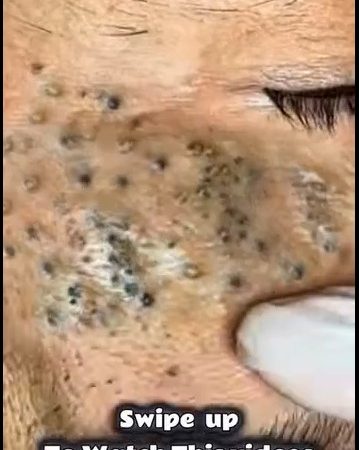 At first glance, the image looks like something out of a skincare “shock video”—a close-up of a cheek packed with dark, clustered spots, surrounded by textured pores and inflamed skin. A gloved hand presses gently against the area, as if preparing for extraction. The caption at the bottom (“Swipe up to watch this videos”) suggests it’s part of a viral blackhead-removal clip, the kind that spreads quickly because people can’t look away.