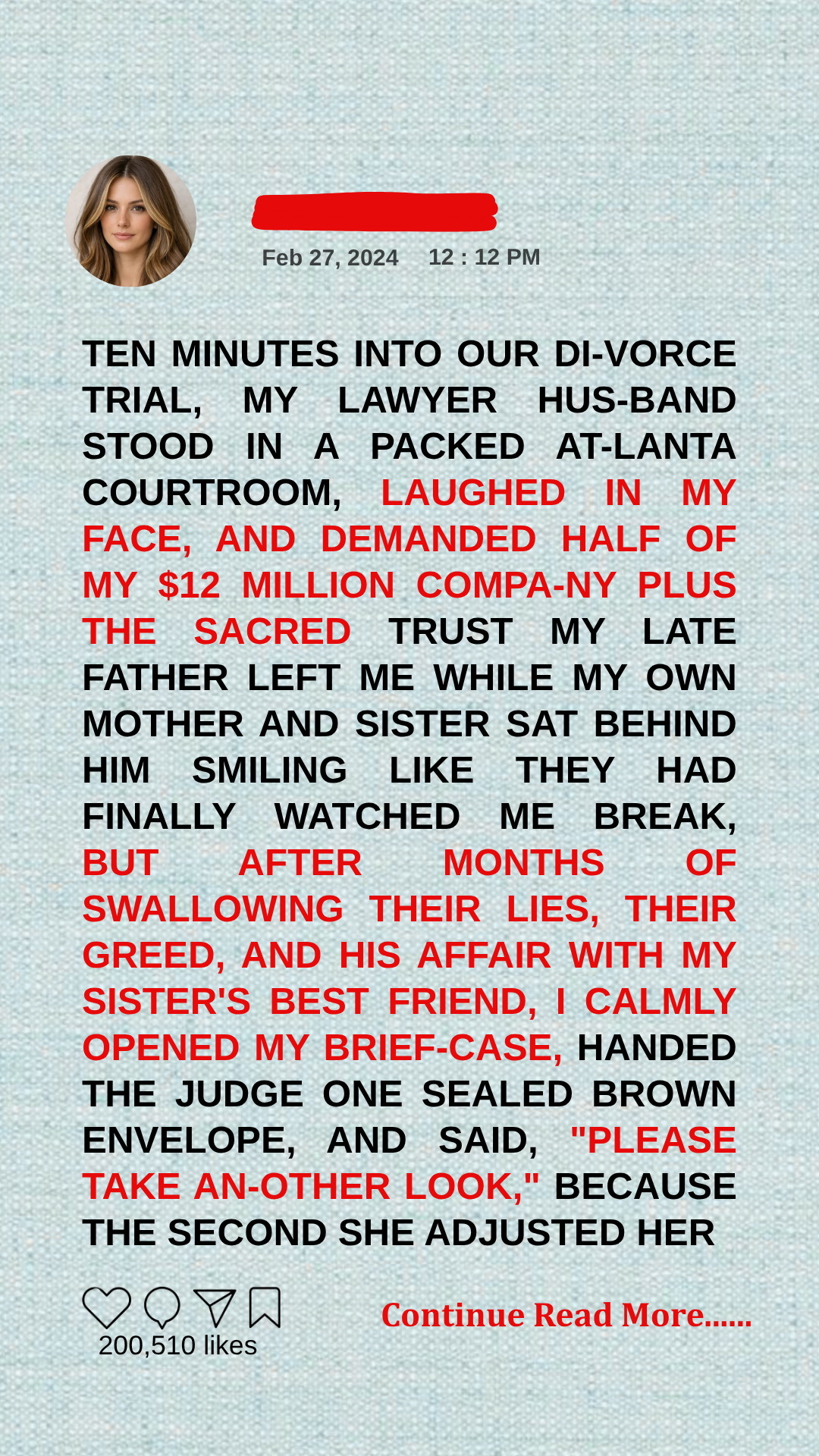 My mother, Brenda, had on a cream suit and a strand of pearls she could not have afforded without some man paying for them. My sister, Jasmine, wore a fitted designer dress and a smile she was trying—and failing—to hide. Beside her was Trent, her husband, with his smug jaw and his expensive watch purchased with money he had not earned. My own blood sat directly behind the man trying to strip me down in open court, and the delight on their faces was not subtle. They leaned toward one another, whispering, satisfied already. I knew that look. It was the look they wore when they believed the workhorse had finally stumbled.