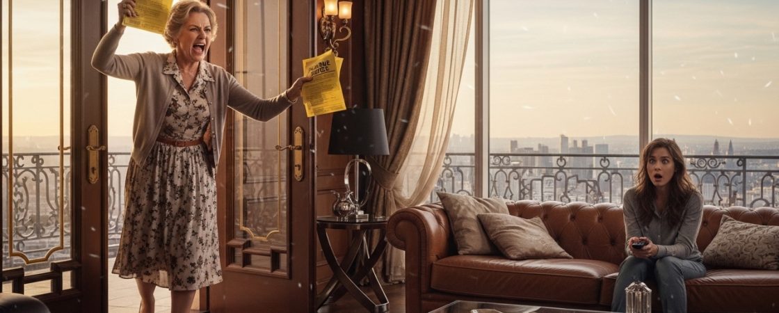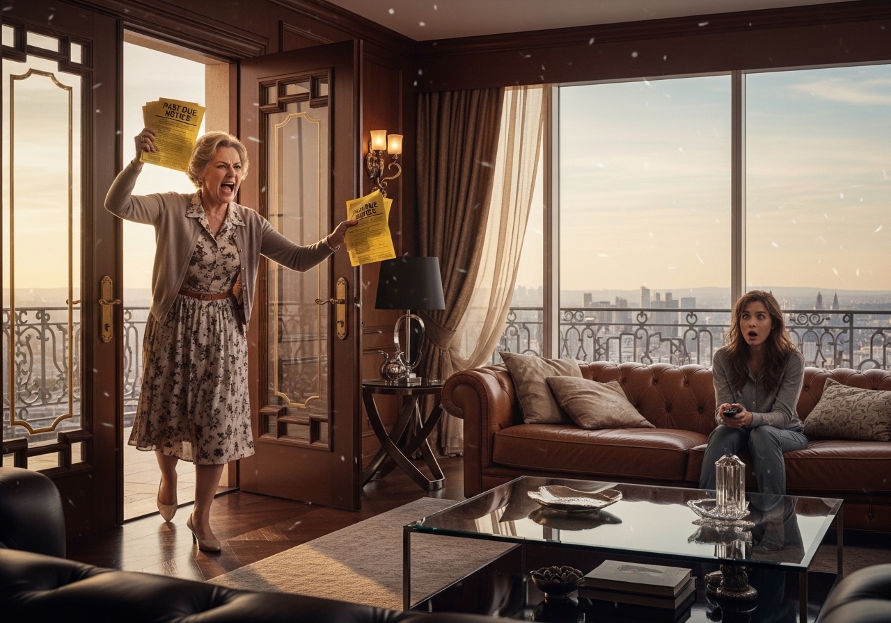 My mother-in-law, Eleanor, barged into my penthouse apartment waving a thick stack of past-due notices and slammed them down on the marble kitchen island. She didn’t even bother with a greeting.