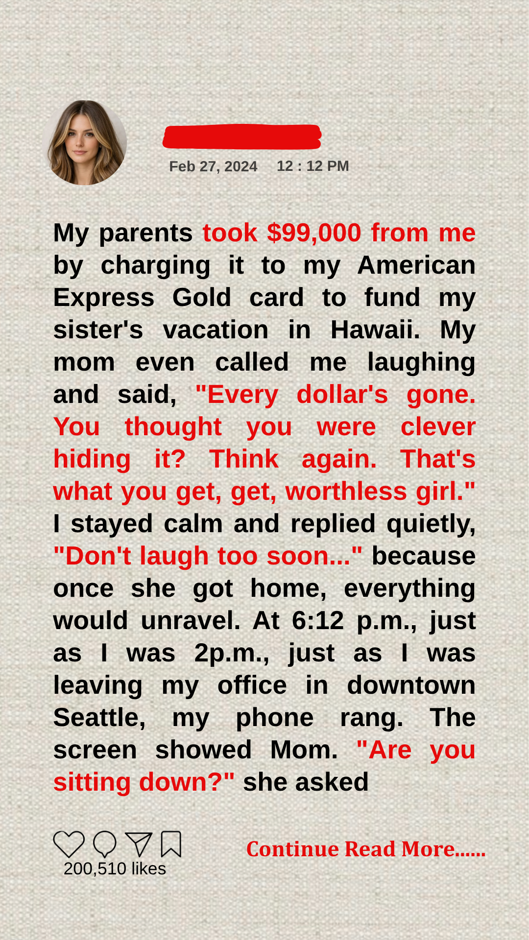 My parents took $99,000 from me by charging it to my American Express Gold card to fund my sister’s vacation in Hawaii. My mom even called me laughing and said, “Every dollar’s gone. You thought you were clever hiding it? Think again. That’s what you get, worthless girl.” I stayed calm and replied quietly, “Don’t laugh too soon…” because once she got home, everything would unravel.