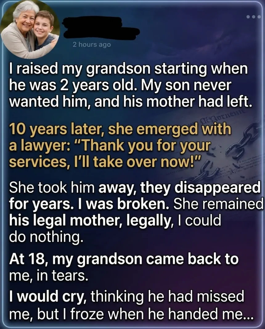 There was no warning. No time to prepare. No moment where I could sit down and think about what it would mean. One day I was simply a grandmother living an ordinary life, and the next I was staring into the wide, frightened eyes of a child who didn’t understand why his world had suddenly collapsed.
