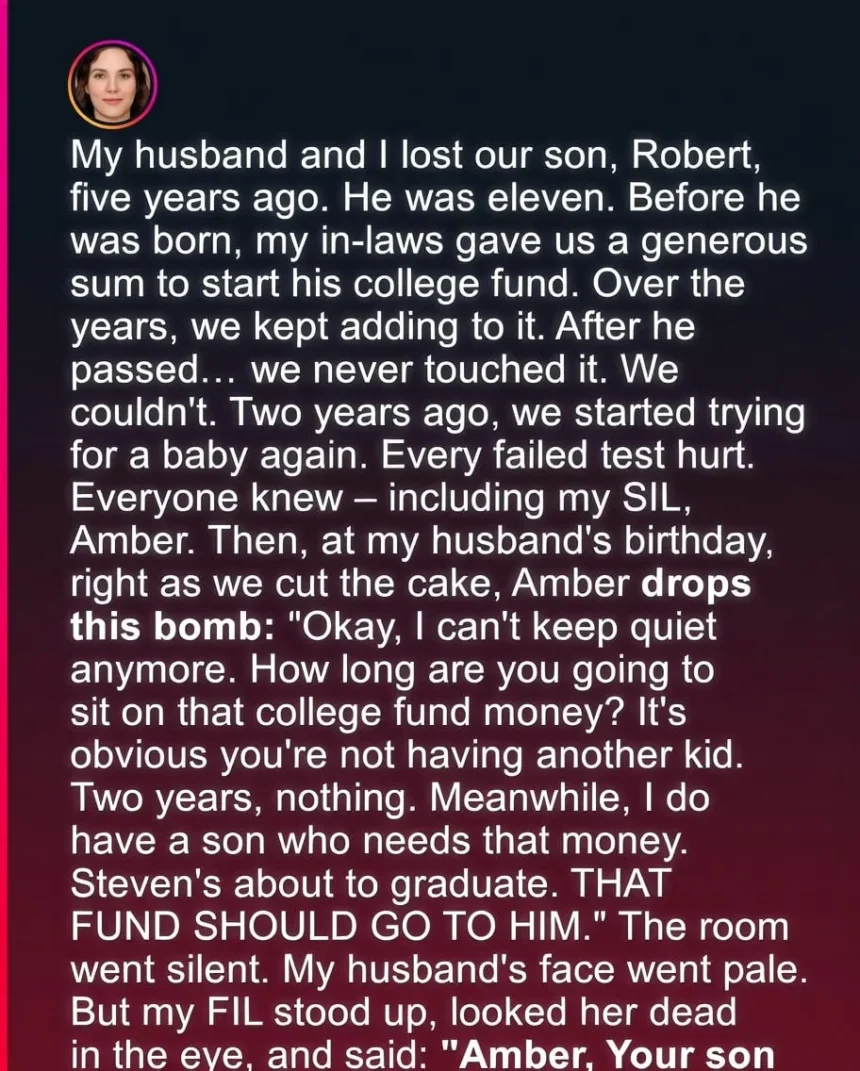 “You know,” she said, stirring her coffee slowly, “I’ve been thinking… Robert’s college fund is still sitting there, right?”