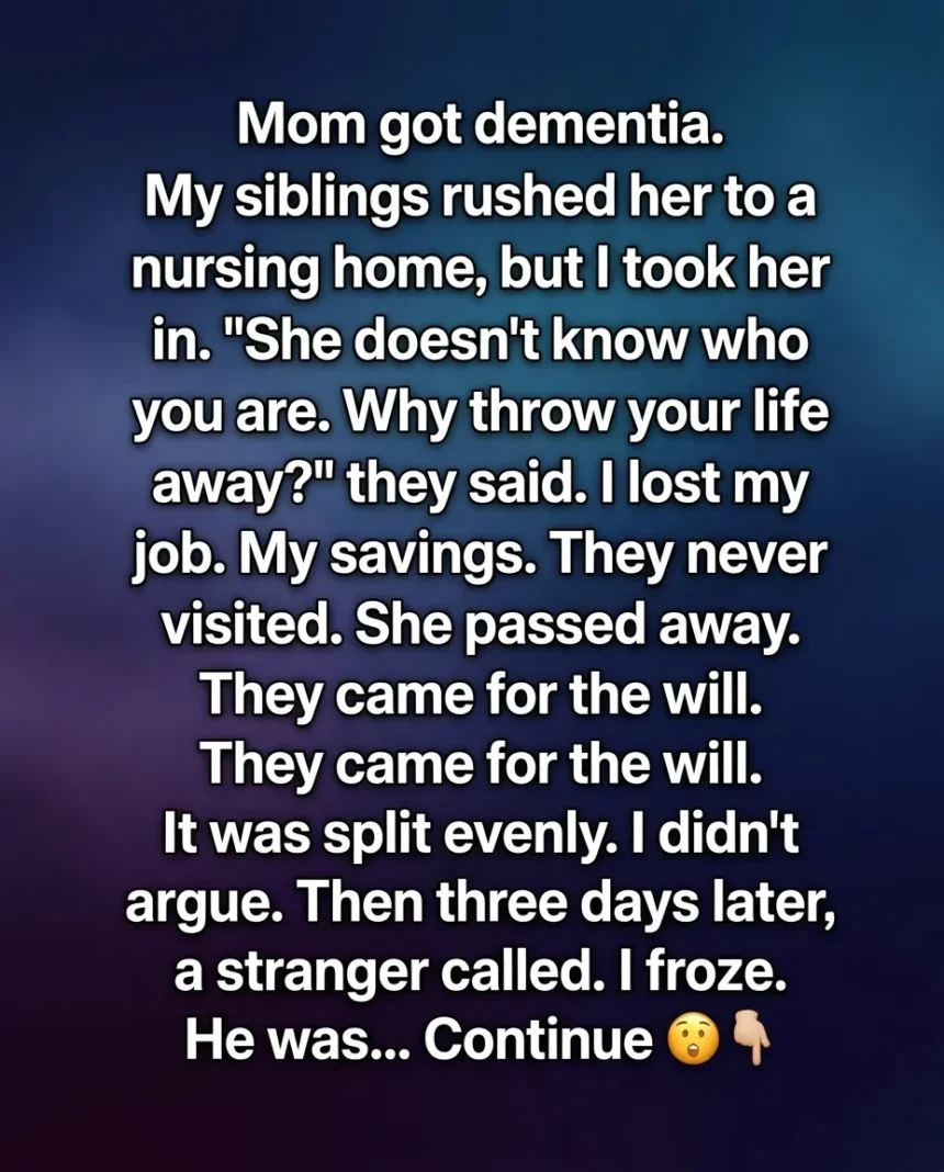 “She asked me to wait until after the will was read,” he said. “She didn’t want your siblings to know. She didn’t want arguments. She didn’t want you accused of manipulating her.”