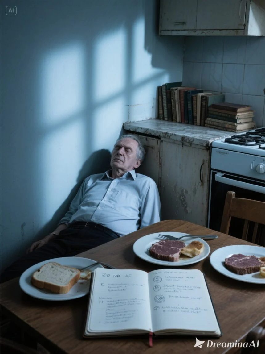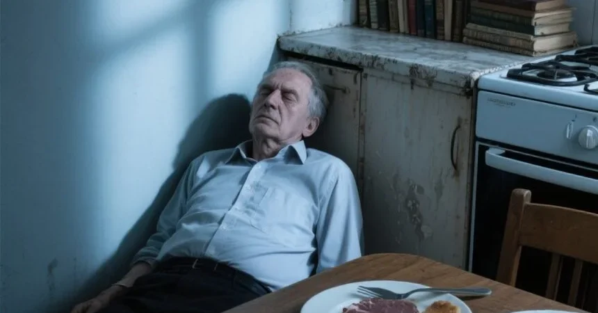 He was sitting at the table, slumped slightly forward, as if he’d just grown tired mid-thought. His hands rested near his plate. His expression was calm.