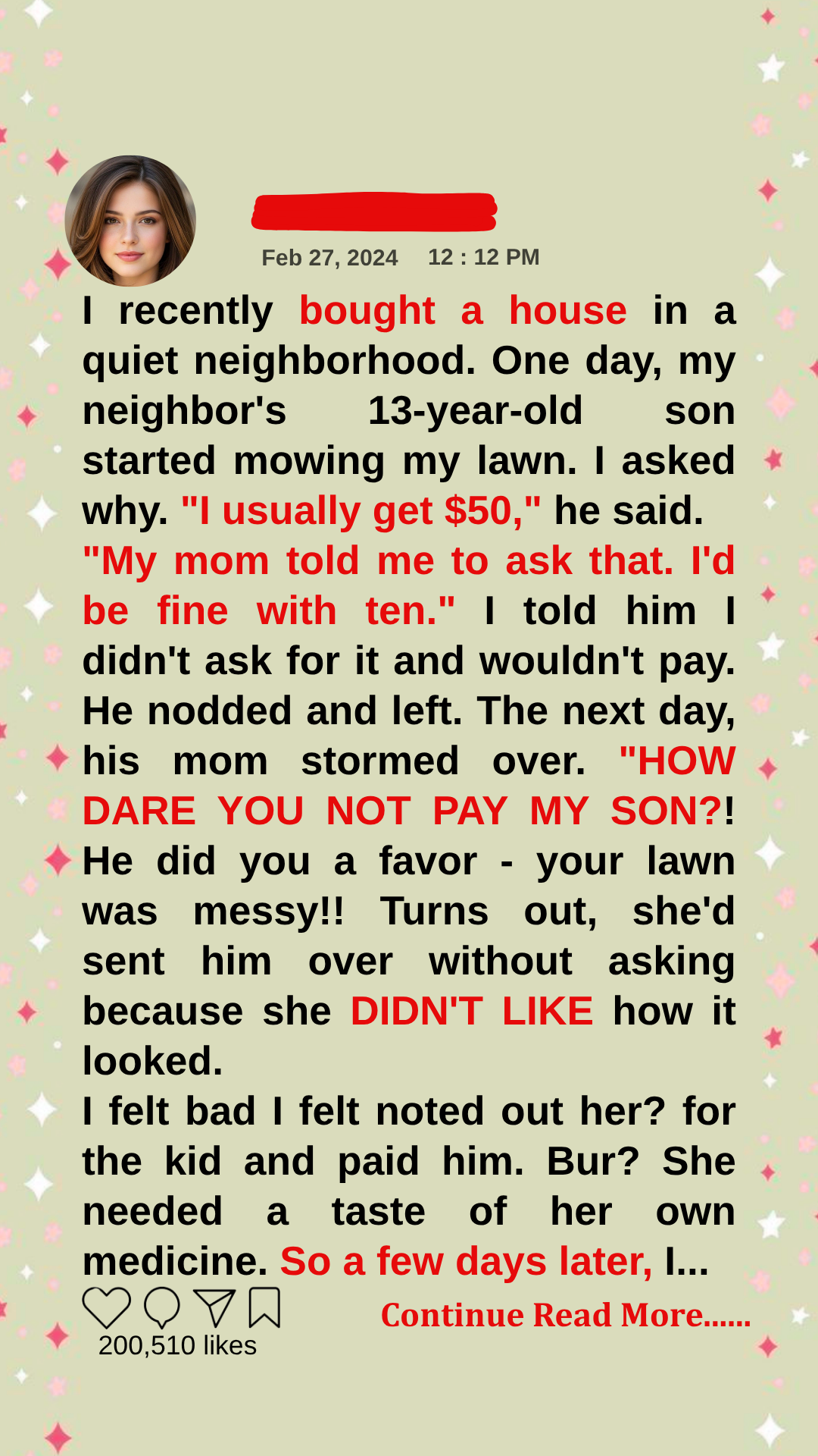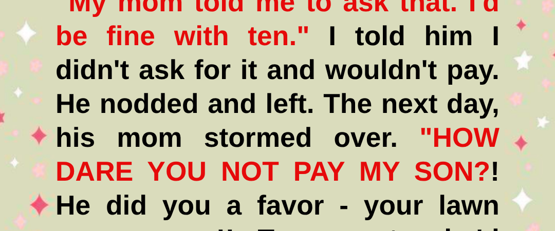 Homeownership is an American dream… until your neighbor thinks your lawn is her business. Mine sent her son to mow it without asking, then demanded $50. I refused and gave her a taste of her own logic… because some lessons hit harder when the mirror turns back on you.The late afternoon sun beat down on my neck as I pulled into the driveway of my new home. Twenty-nine years old and finally a homeowner. What a milestone! The modest two-bedroom in Oakridge Estates wasn’t much, but every mortgage payment, every creaky floorboard, and every blade of grass was… mine. I killed the engine and sat for a moment, taking it all in. It had been three weeks since I’d moved in, and the reality still hadn’t fully sunk in. The “For Sale” sign was gone, replaced by my beloved flower beds. As I stepped out of my car, the distinct buzz of a lawnmower caught my attention. Odd. I wasn’t expecting landscapers. Rounding the corner of my house, I stopped short. A lanky teenager was pushing a mower across my front yard, already having cut neat lines through half of it. He hadn’t noticed me yet and was focused on his task with wireless earbuds jammed in his ears. I approached slowly, waving to get his attention. “Hey there,” I called out when he finally looked up. The boy—maybe 13 or 14—pulled out an earbud. His face was flushed from the heat and sweat dampened his brown hair. “Hi,” he replied, letting the mower idle. I’m Alex,” I said, gesturing toward the house. “I live here. Did I… miss something? Why are you mowing my yard?” The kid shifted uncomfortably, glancing down at his sneakers before meeting my eyes again. “I’m Tyler. I live over there,” he pointed to the blue colonial across the street.