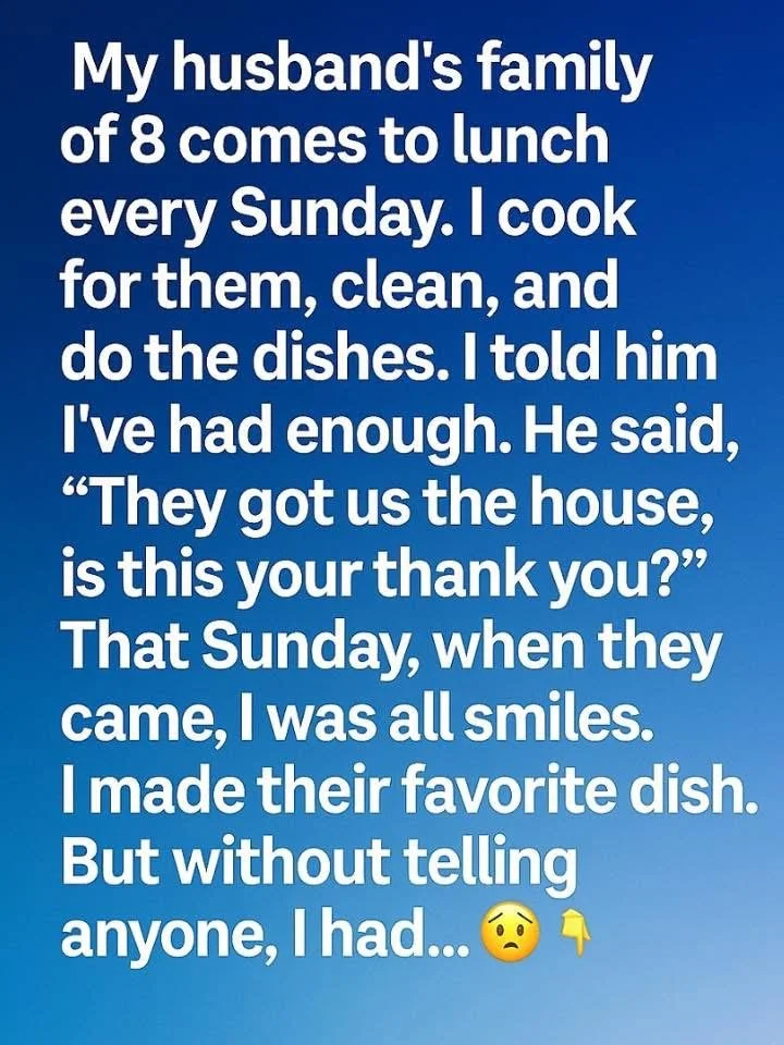 Not because I didn’t appreciate his family—but because he spoke as if I was ungrateful, as if cooking for eight people every Sunday was some small favor I was refusing to do.