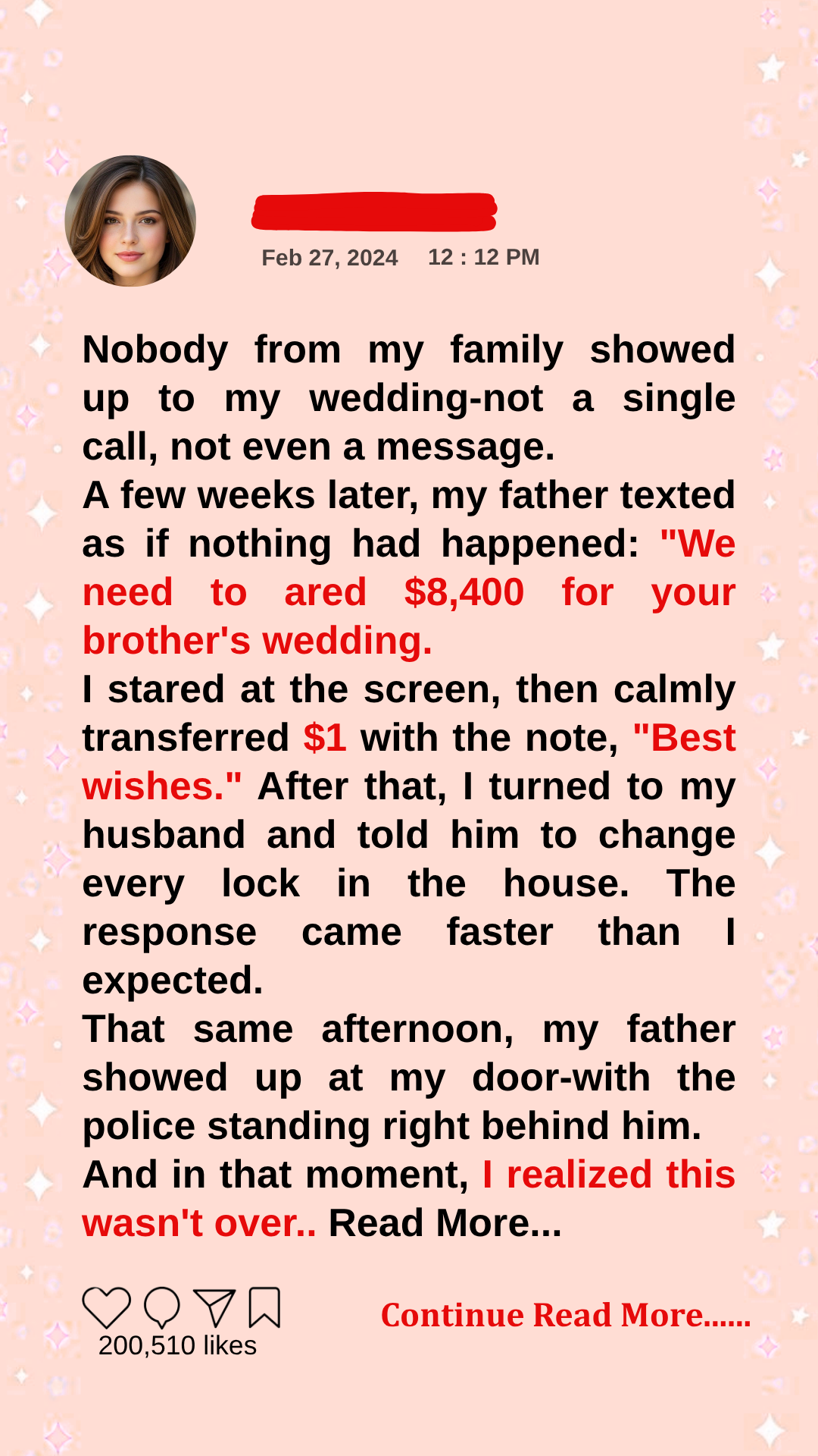The healing process was incredibly slow and deeply painful, but with Thomas’s unwavering, patient support, I finally began to completely release the heavy, toxic burden of my misplaced, lingering guilt. We returned to our quiet, peaceful suburban home, ready to officially begin our new chapter entirely free from the suffocating, dramatic shadows of my past. Then, precisely one month after my wedding day, my cell phone vibrated violently on the kitchen counter, displaying an incoming text message from my father. My heart hammered a frantic, terrified rhythm against my ribs as I slowly opened the notification, foolishly hoping for a delayed, profound apology or a desperate, remorseful explanation for their horrific, unforgivable absence. Instead, I stared completely blankly at the glowing screen, my stomach churning with absolute, unadulterated disgust as I read the incredibly casual, profoundly audacious words he had typed. “We need $8,400 for your brother’s wedding,” the message demanded, completely ignoring the fact that they had just aggressively, publicly disowned me.