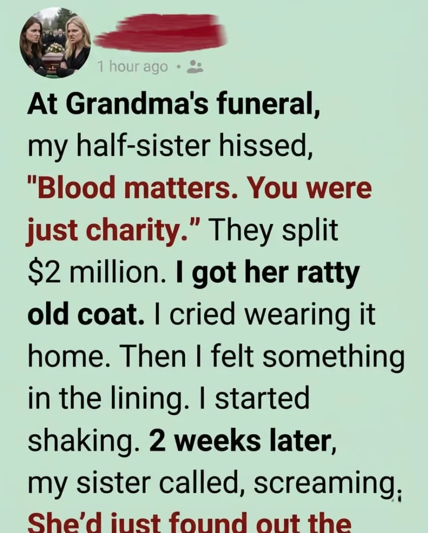 She came to the funeral wearing her old brown coat and gloves, and she stood beside my mother’s grave like she belonged there. Afterward, she knelt in front of me, looked me directly in the eyes, and said the words that would shape the rest of my life: